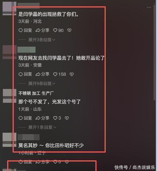 不过一看评论区,网友们似乎有点不懂得嗅到节日的气氛,狠狠地怼了过去,语气可真是没留情面,满满的阴阳怪气让人看着挺尴尬。甚至有人还“劝慰”说,多亏了闫学晶的事,才让她们这次没被网友们的攻击冲得毫无还手之力,看来网友们心里还是存着点芥蒂的嘛。
