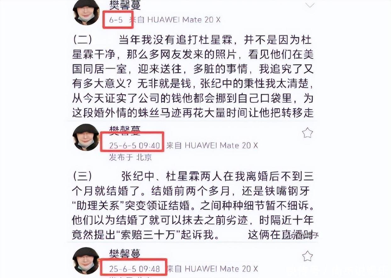 更让人觉得匪夷所思的是,之后樊馨蔓又爆料,网友把好多张杜星霖和老张一起出现的照片发给了她,让她一下子明白,原来老张早就心怀鬼胎,暗藏阴谋了。她一边被骗了钱,一边还被蒙骗了感情,哪受得了这种事啊?所以,从那以后,到现在为止,她对张纪中的官司就没断过,总是在控诉不断。