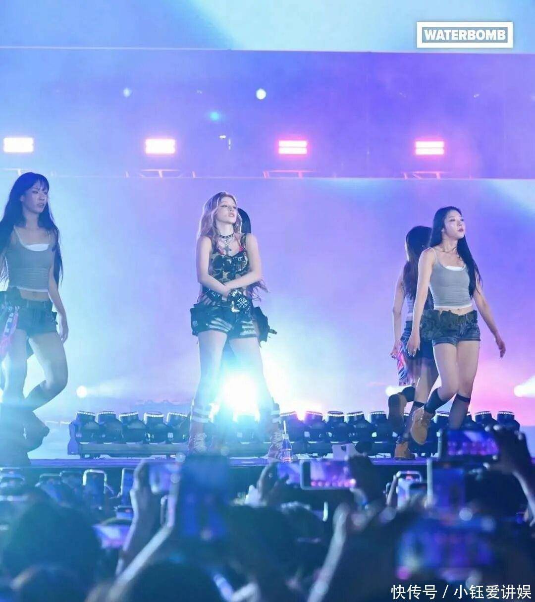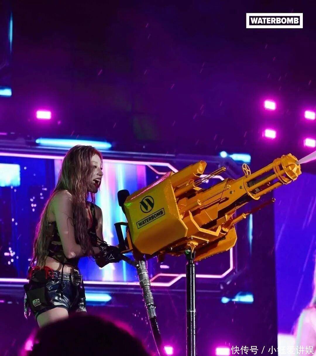 她演唱新歌《M.O.》时手持水枪向观众席洒水,清凉水雾打破舞台边界,观众直呼“被淋湿也心甘情愿”。她配合撩衣动作露出腰腹,瞬间点燃尖叫,被媒体称为“顶级魅惑时刻”。